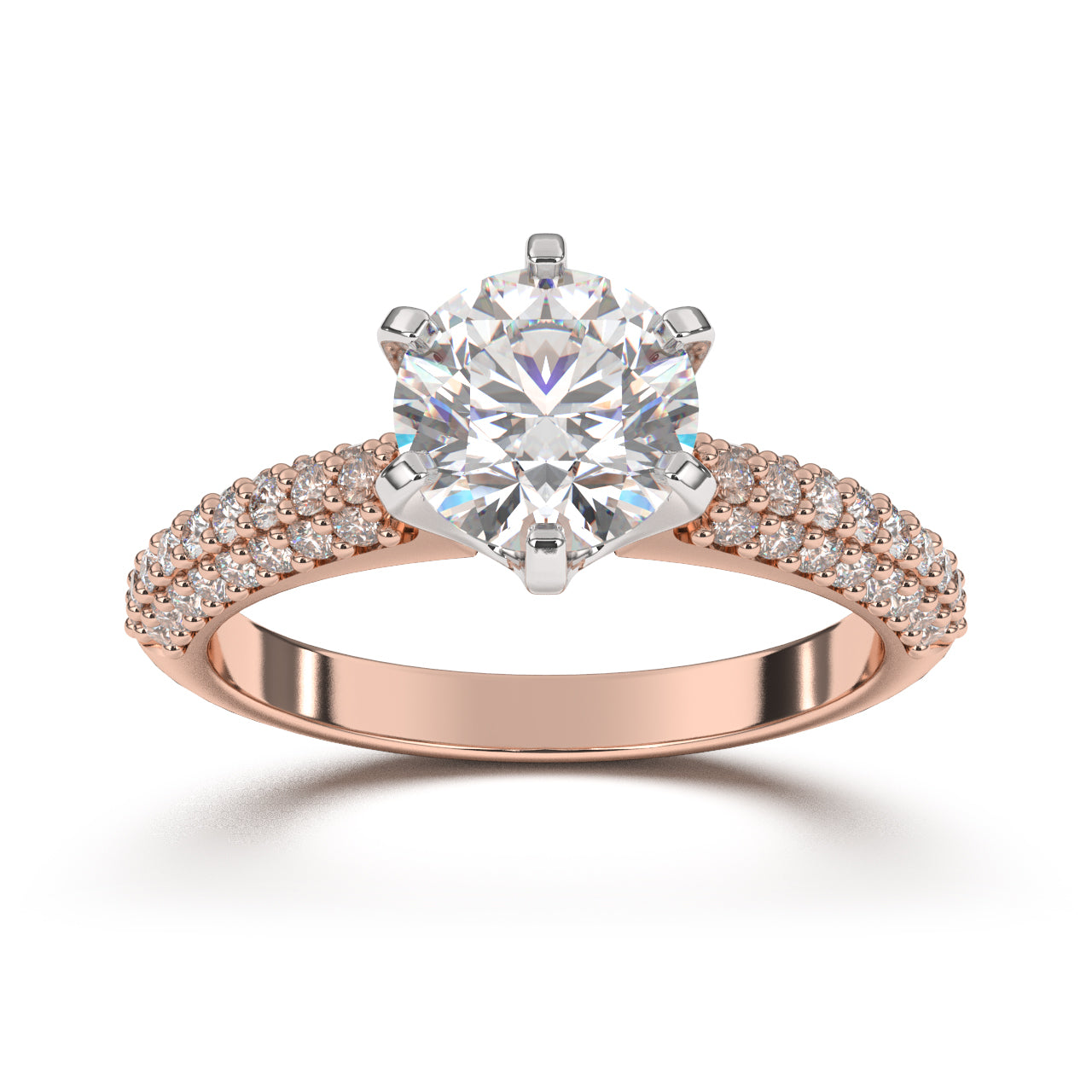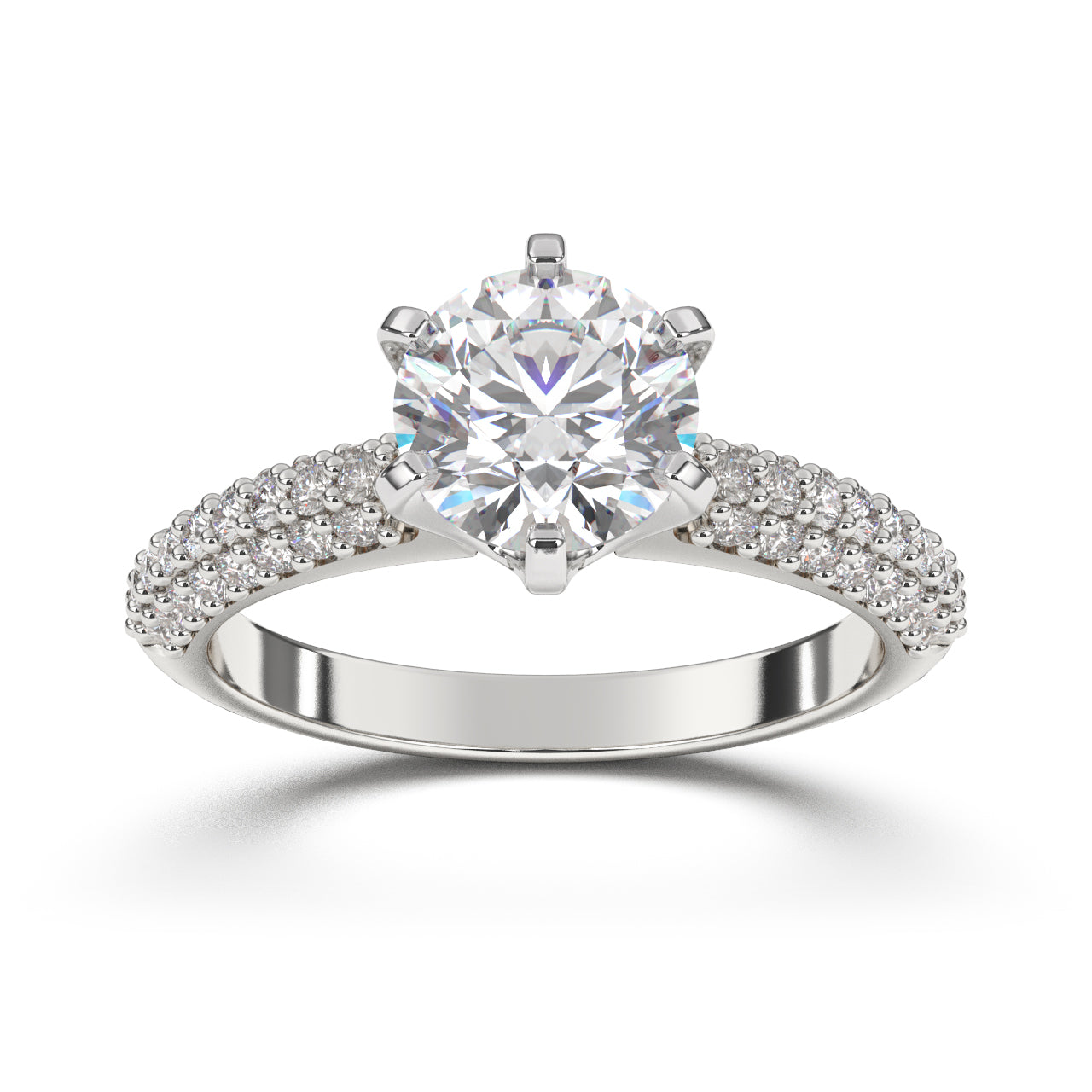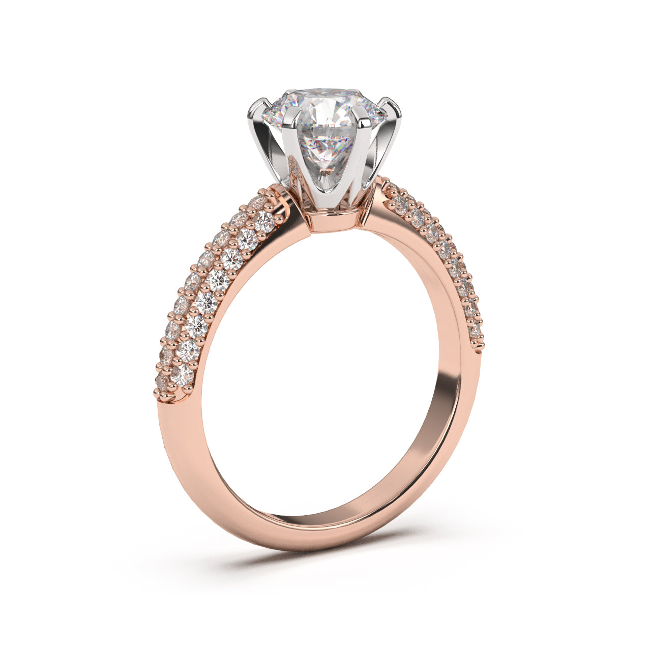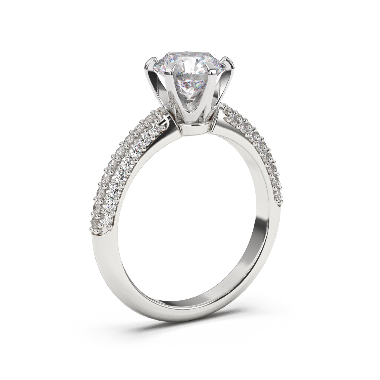 El anillo de compromiso Shangai captura la magnificencia y el brillo con su diseño opulento. La gema central, impecablemente enmarcada por una montura segura, es el foco visual, mientras que los diamantes incrustados a lo largo de la banda añaden un espectáculo de luz y reflejo que no deja de impresionar. La combinación de la sencillez de la banda y el lujoso arreglo de gemas hace de Shangai una pieza perfecta para quienes buscan un anillo brillante.