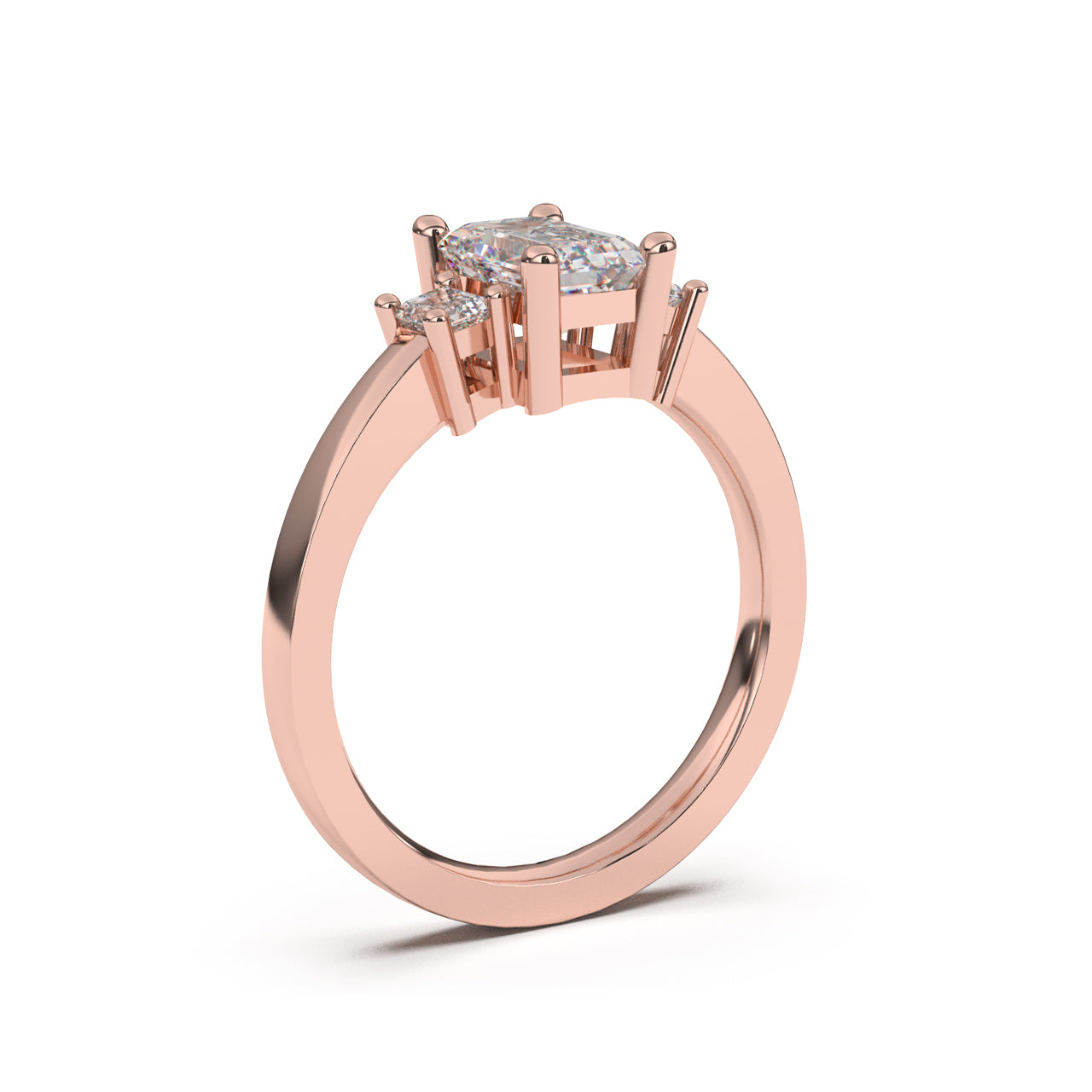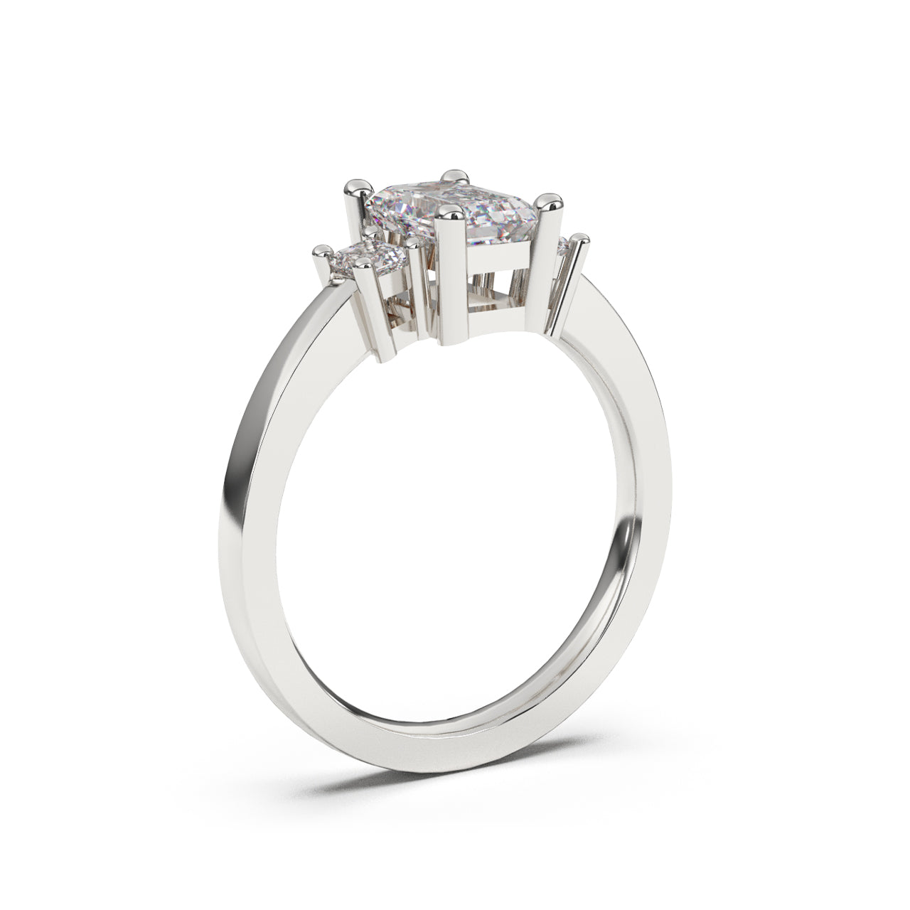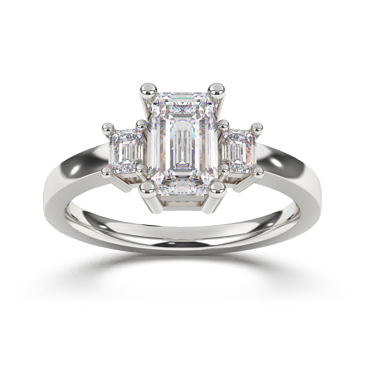 El anillo de compromiso Versalles refleja la elegancia clásica. Este anillo presenta tres gemas de corte esmeralda, cada uno enmarcado para resaltar su luminosidad y precisión. Con una montura detallada y una banda pulida, este diseño combina el lujo tradicional con una estética moderna.